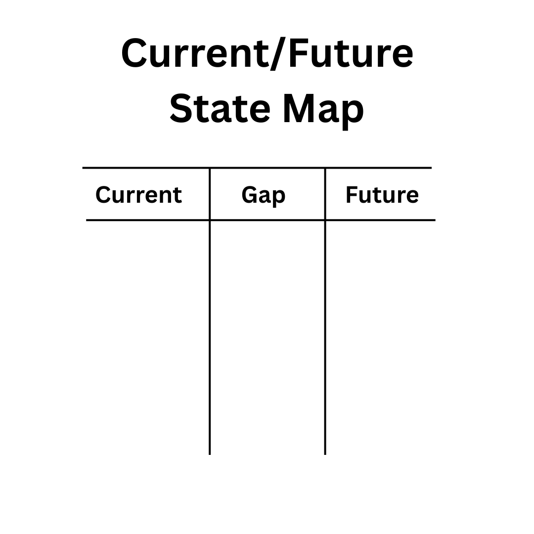 The Current/Future State Map is our blueprint for change. It captures a clear picture of where you are today — your strengths, challenges, and constraints — and contrasts it with the future you want to create. By assessing both states side‑by‑side, we can pinpoint the exact gaps that need to be closed. This clarity allows us to focus effort where it matters most, turning ambition into a targeted, achievable plan.